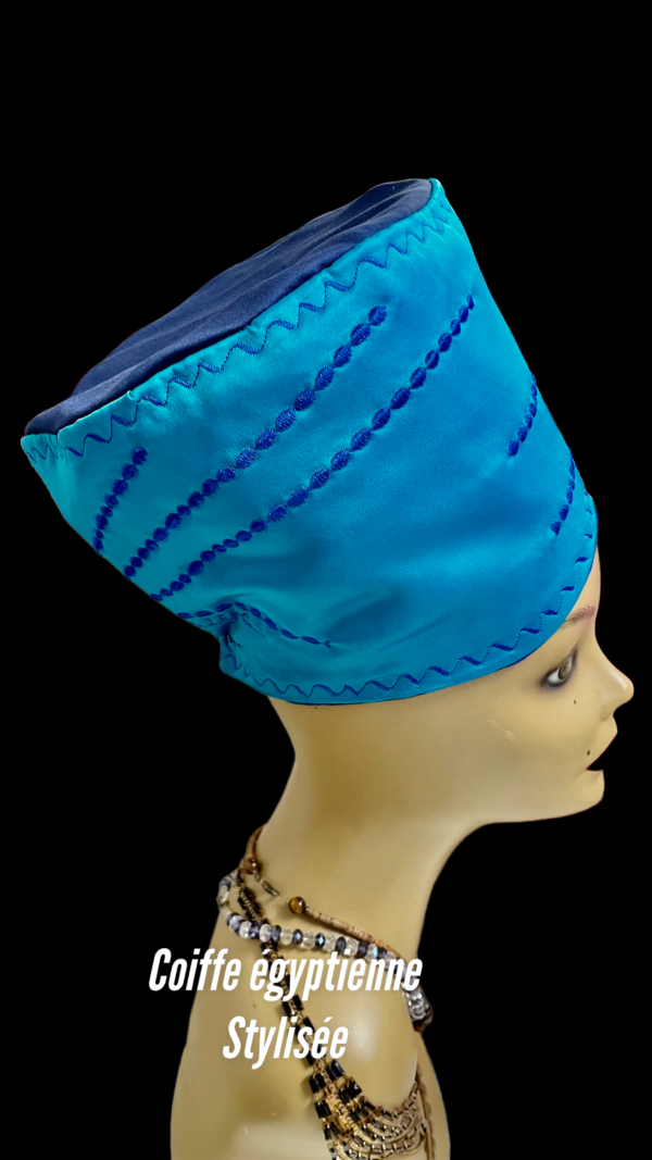Très belle coiffe égyptienne stylisée en satin duchesse bicolore pour agrémenter votre tenue vestimentaire? très agréable à porter. Tour de tête allant de 58 à 60 cm. Hauteur 18 cm, entretien facile en machine, programme laine, pas d’essorage.